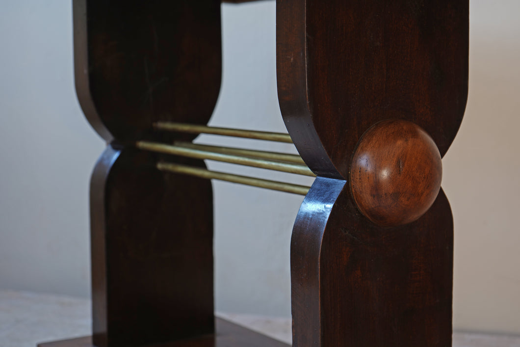 Elegant side table with book-matched walnut veneer on the top and base. Metal stretchers add a sleek, architectural touch. A classic example of 1930s French Art Deco design.