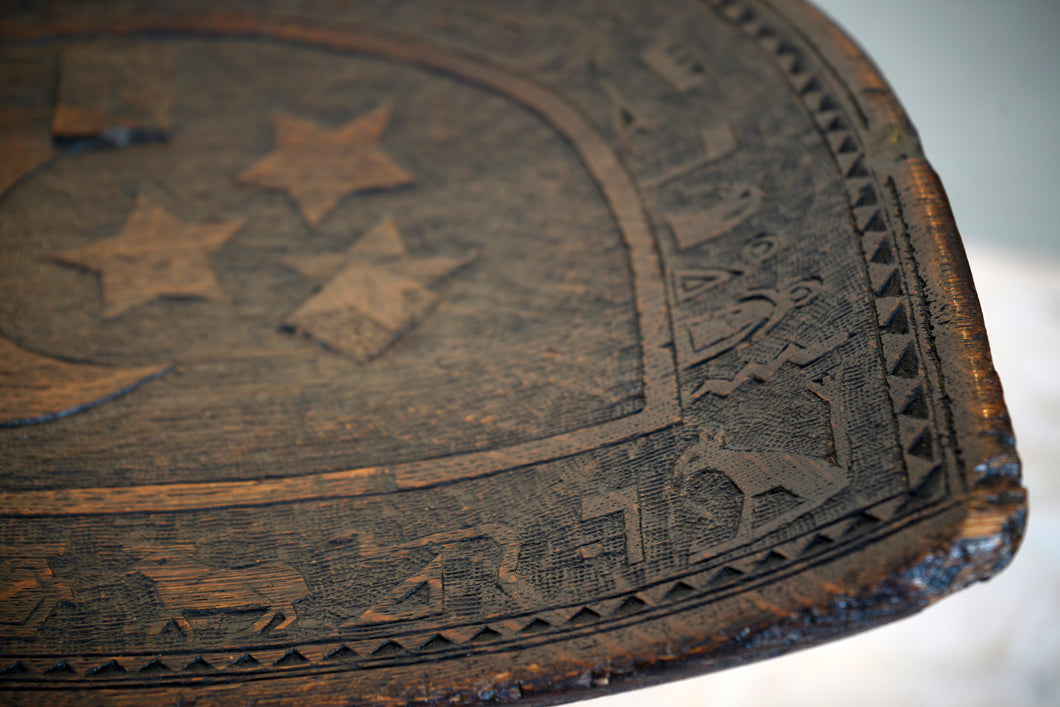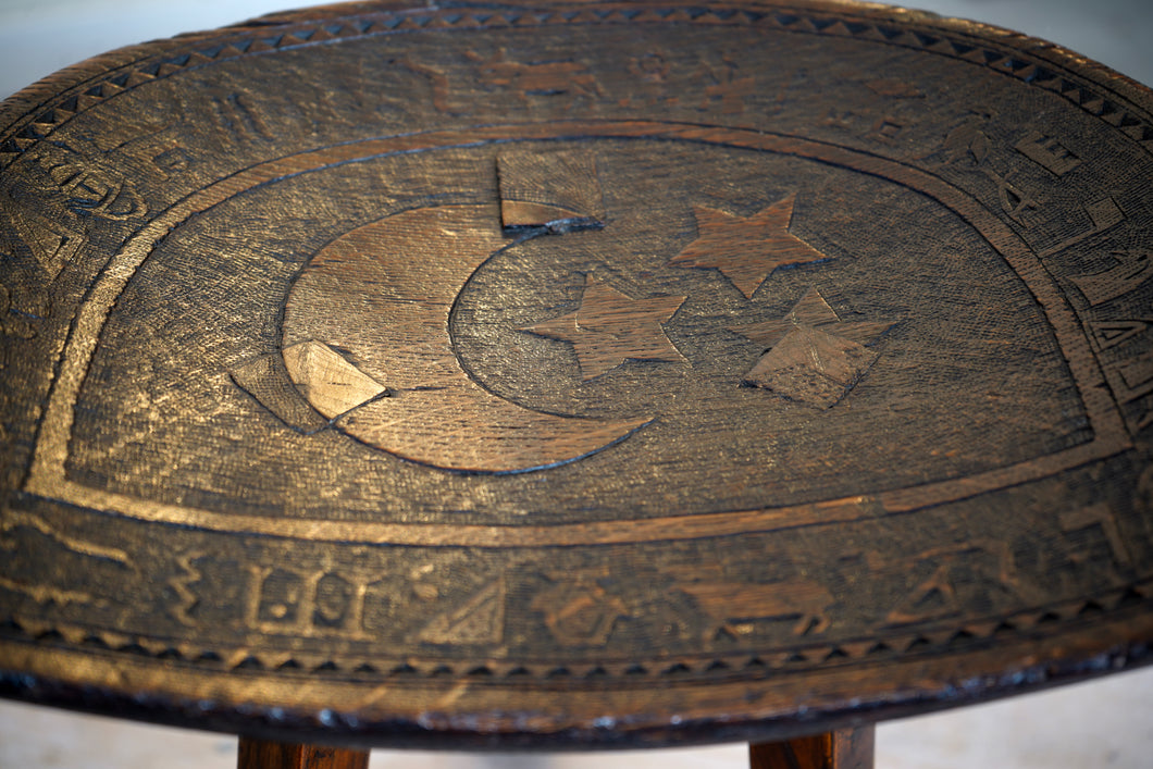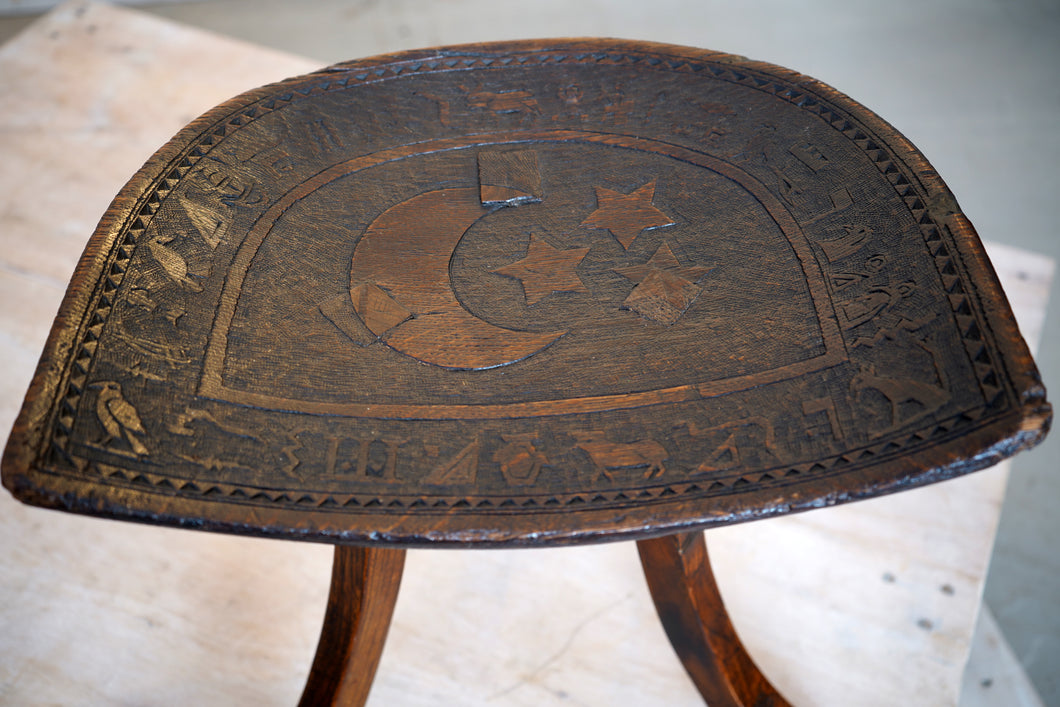 Inspired by the ancient Egyptian stool discovered at Thebes, this Liberty & Co. stool was produced circa 1900–1920 during London’s Egypt-mania. Elegantly three-legged and finely carved with zodiac motifs around the seat, it’s a beautiful example of the iconic Thebes design. One leg has a very good old repair, please see pictures.