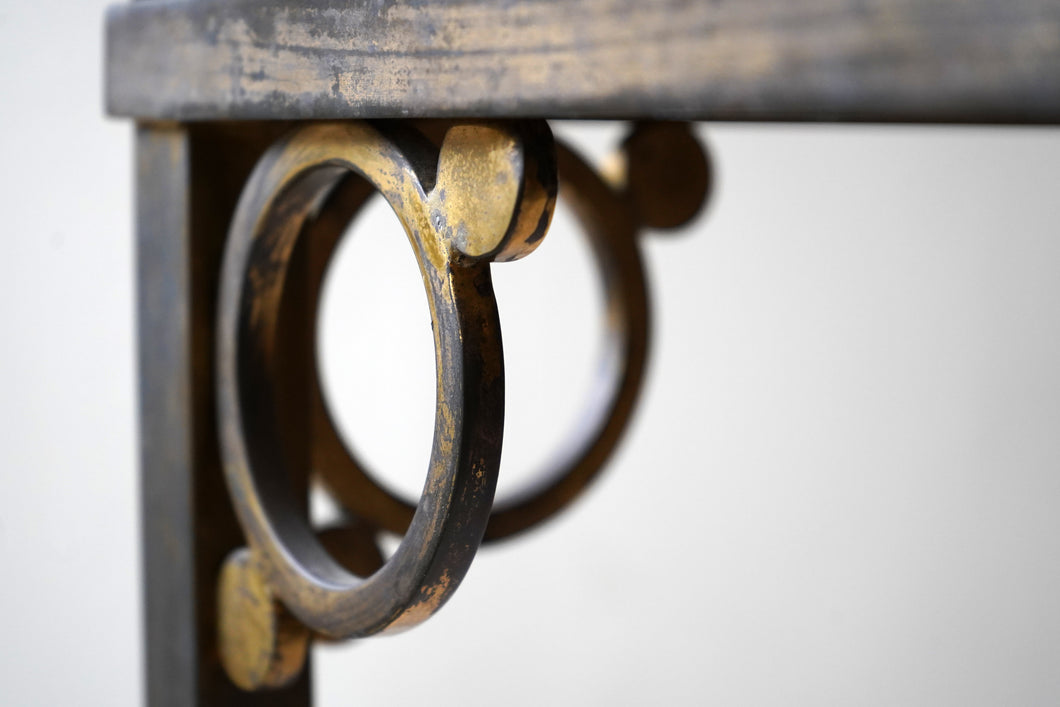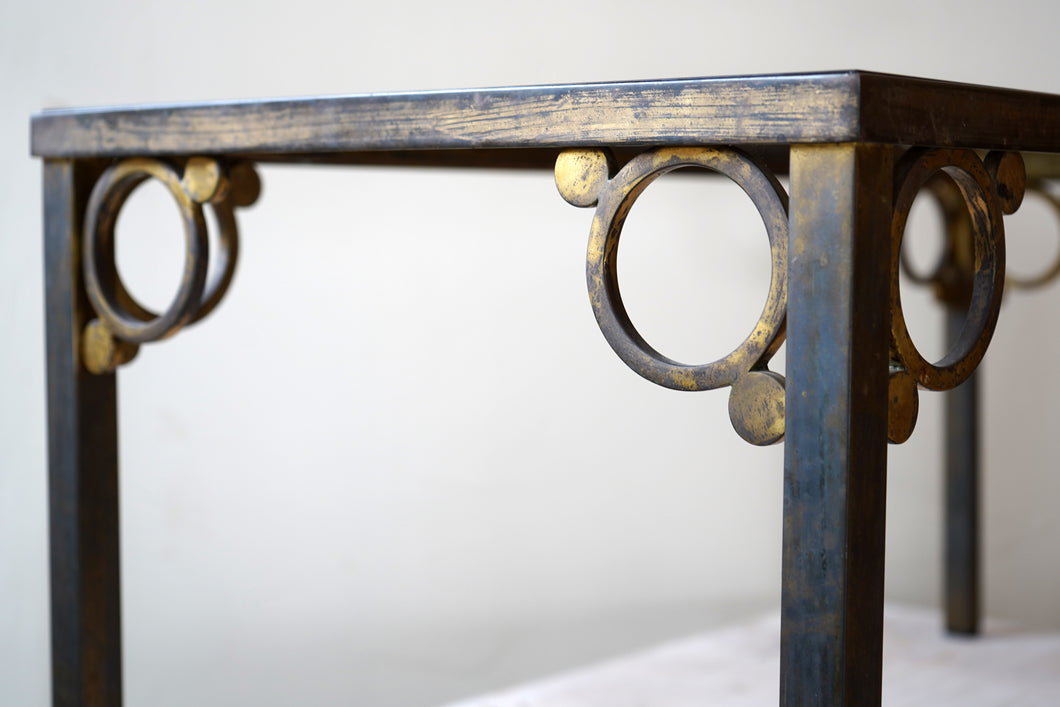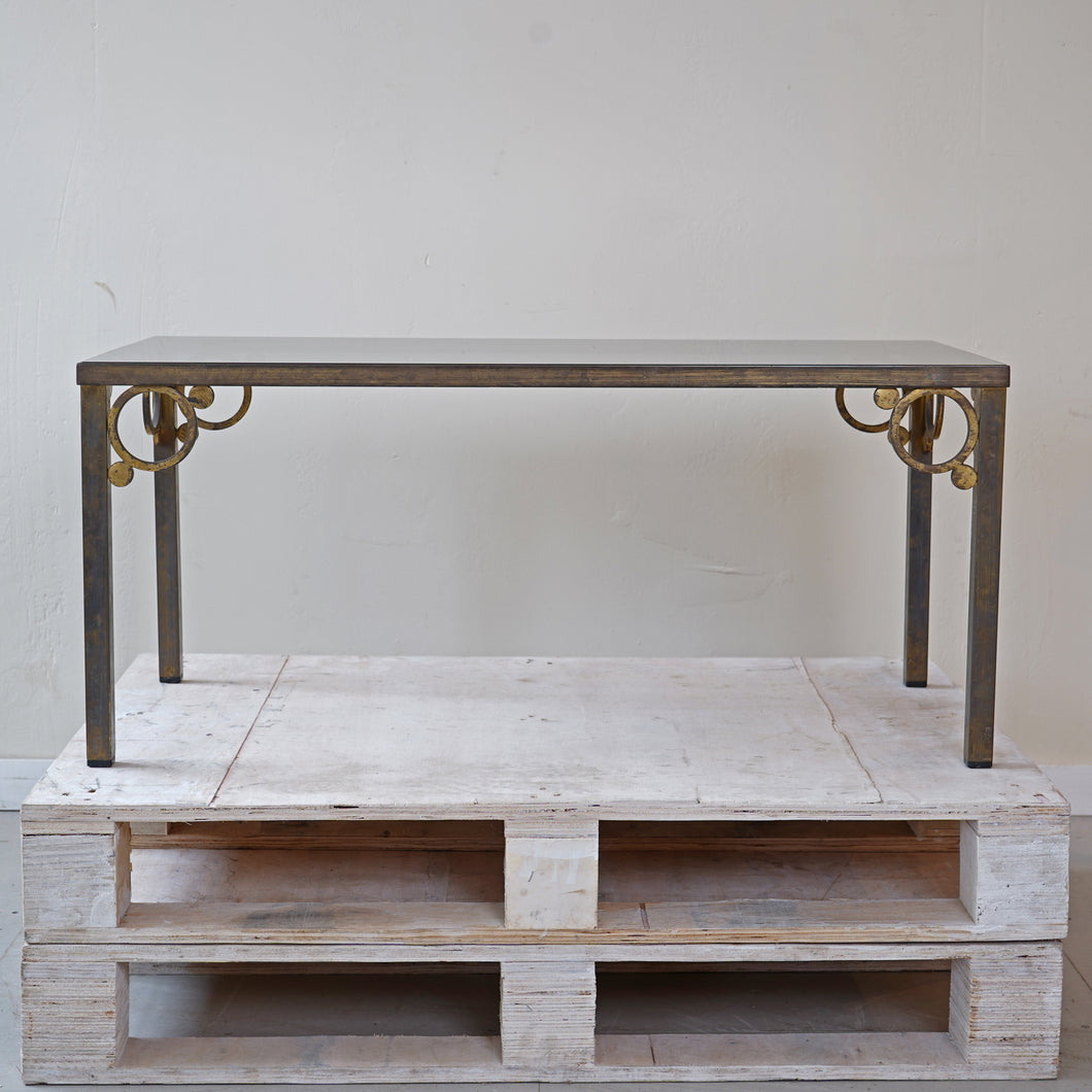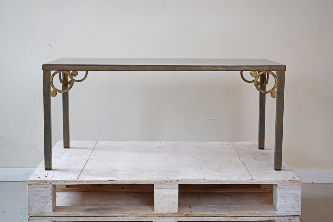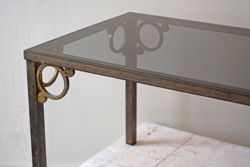 A quality mid to late 20th century coffee table featuring a gilded metal frame and smoked glass top. A sleek, stylish piece with timeless appeal.