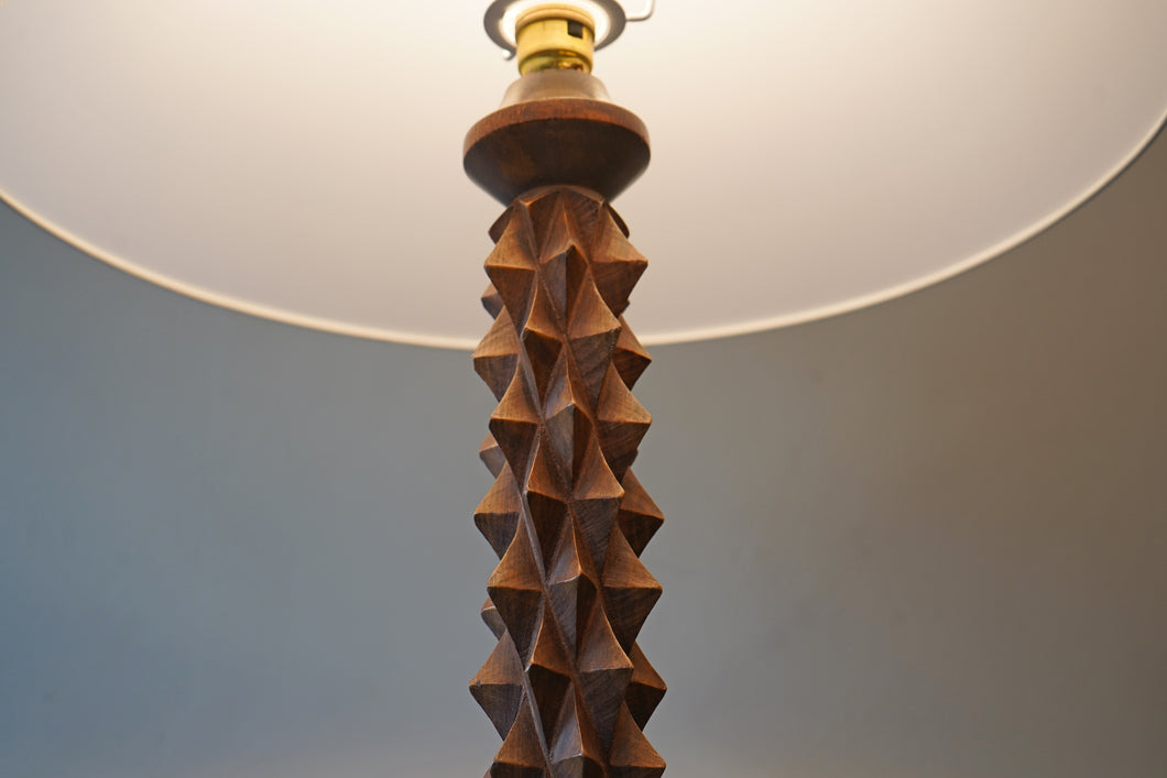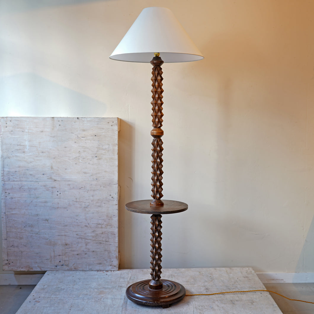 A striking French mid-century floor lamp in the style of Charles Dudouyt, featuring an unusual geometric carved design that captures the sculptural spirit of his work. Recently re-wired and PAT tested for safety. Shade not included.