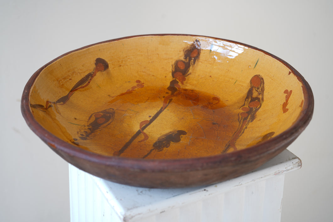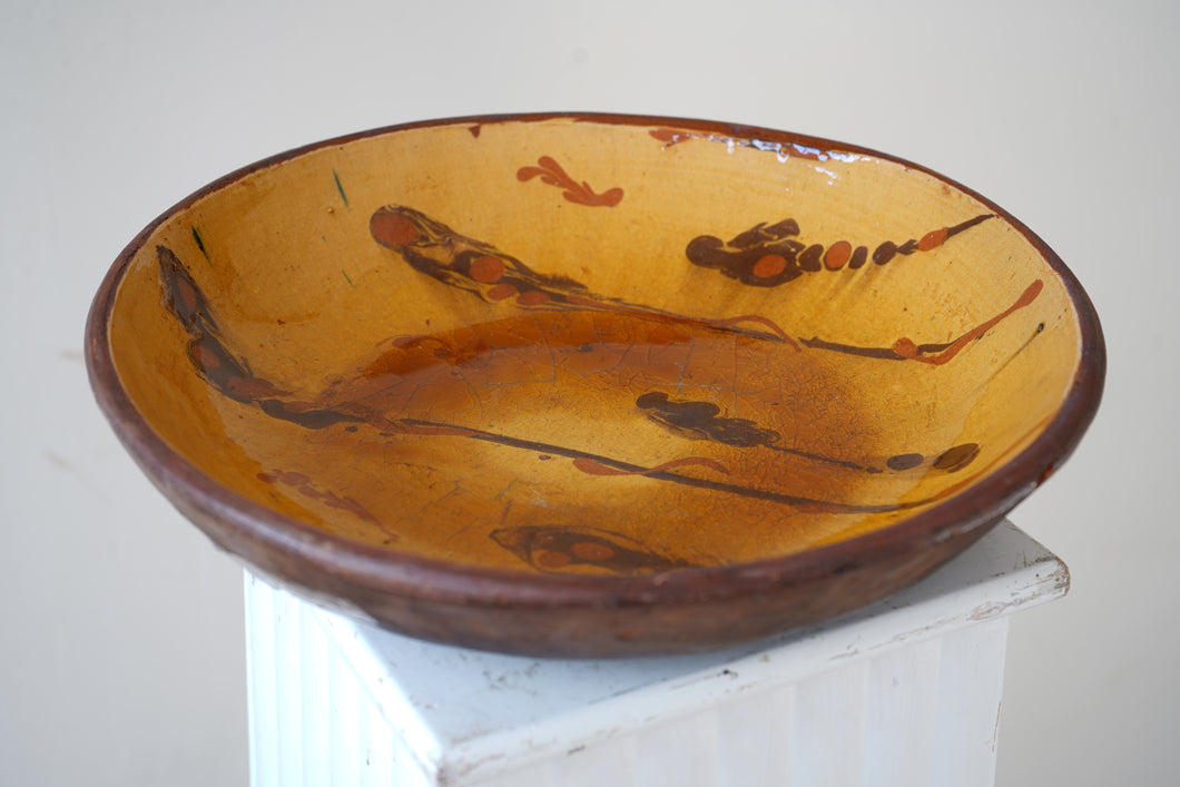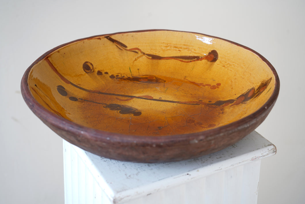 Heavy stoneware slipware dish with a high-gloss glaze. Decorated in a rich ochre yellow with freehand design. Maker and age unknown.