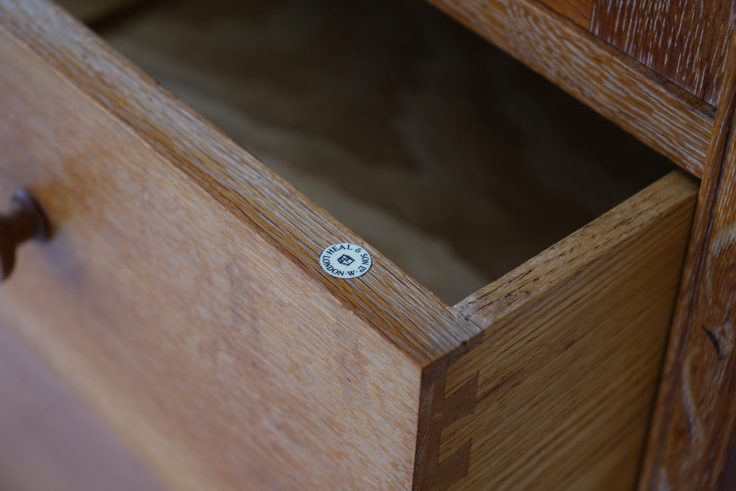 A superb 1930s Heals tallboy cupboard in limed oak, made from high-quality timber. Featuring twin upper cupboard doors with internal shelving, over three graduating drawers with original oak knob handles—all running smoothly. In excellent condition, with the Heals maker’s label inset into one drawer.