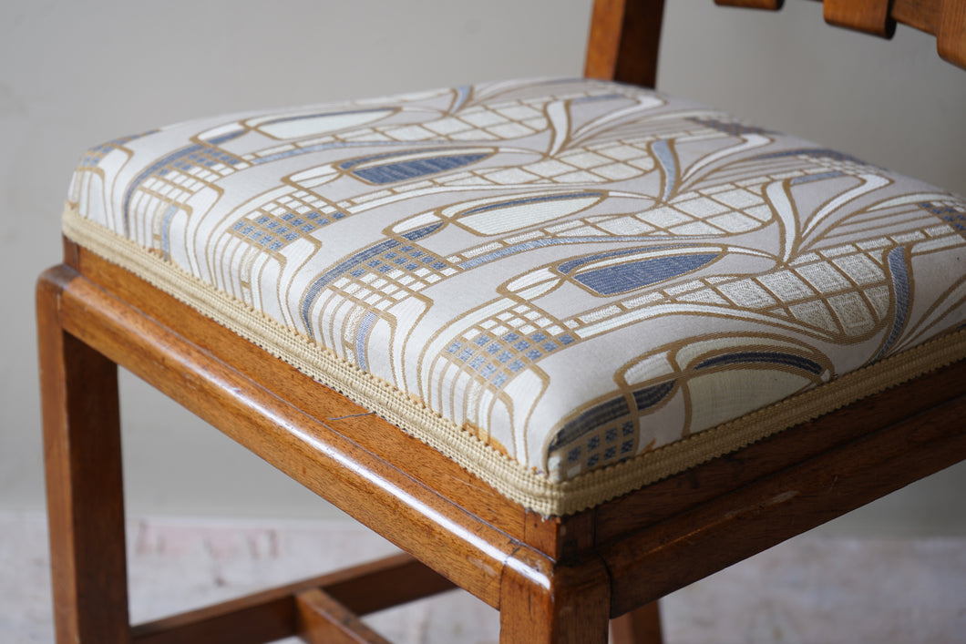 Beautifully crafted from walnut, this elegant set of Art Deco chairs is believed to have been produced for the iconic Heal’s. The design features a distinctive arched top rail and a slatted backrest—both classic elements that add to their architectural appeal. Upholstered in a stylised Art Nouveau fabric, the chairs subtly blend two decorative movements for a truly striking look. Exceptionally well made, they are solid, comfortable, and ready for everyday use.