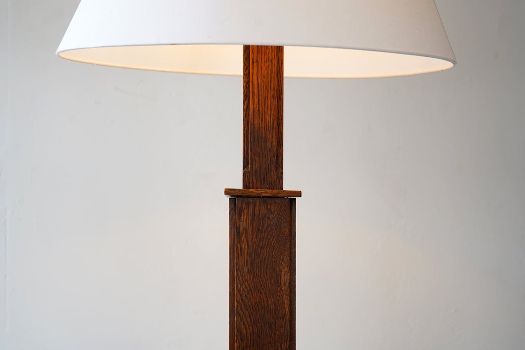 A 1930s English Art Deco floor lamp made from solid oak. It features a stepped pyramidal base and a chunky square stem, giving it a strong, architectural presence typical of the period. Recently rewired and PAT tested, it's fully functional and ready to use.
