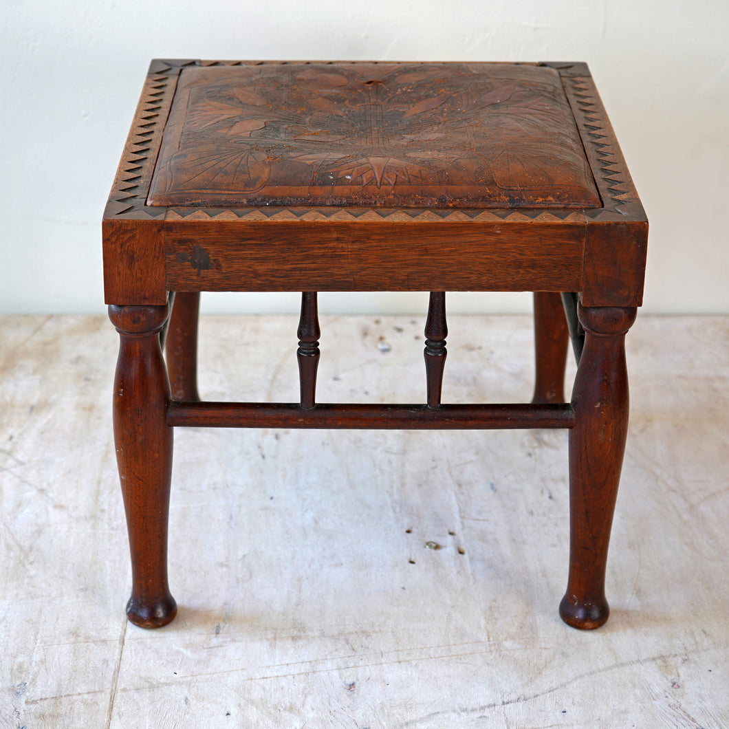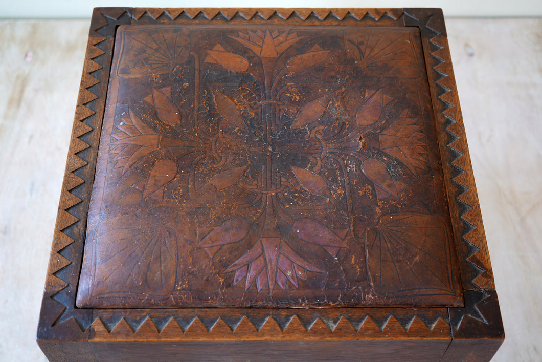 Arts and Crafts footstool with its original embossed leather seat, circa 1900. An untouched piece with beautifully worn leather, rich in colour and character.