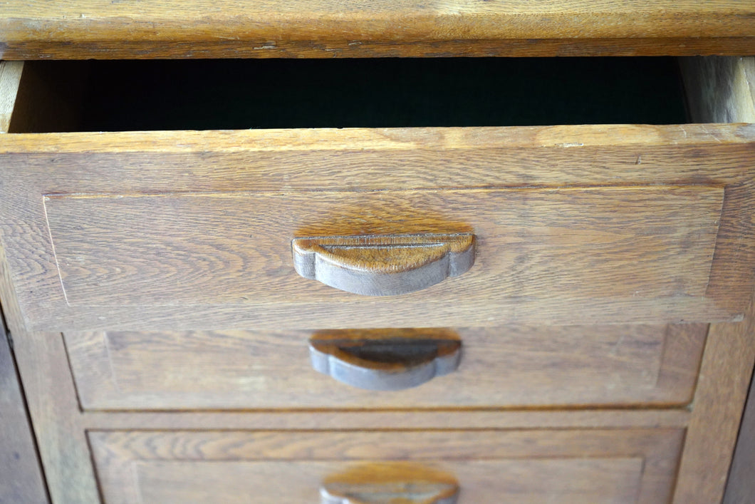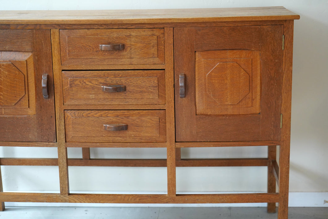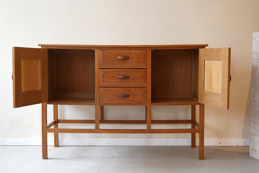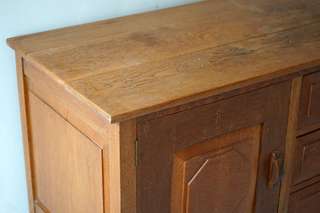 A well-crafted solid oak sideboard, made in the style of Cotswold School designer Ernest Gimson, likely dating to the mid-20th century. With its clean lines, careful proportions, and quality craftsmanship, it’s a timeless and functional piece that reflects the enduring influence of Arts & Crafts design.
