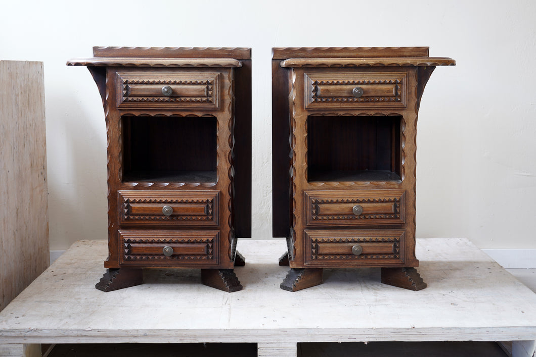An unusual and eye-catching pair of bedside tables, profusely decorated with intricate notch carving throughout.