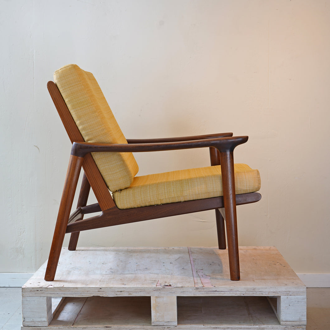 Originally designed in the early 1960s by George Fejer and Eric Pamphilon, this elegant armchair was produced until the end of the decade and sold almost exclusively through Heals of London. Featuring a Scandinavian-inspired silhouette, the frame is crafted from solid afromosia wood, now carefully cleaned and waxed to restore its natural beauty.