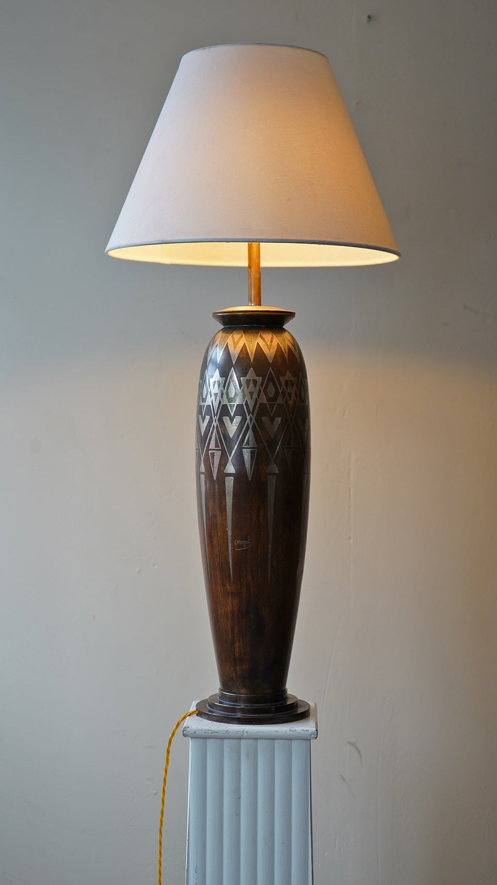 A striking example of Art Deco design, this large dinanderie table lamp originates from France, circa 1930s. The piece features bold geometric patterns crafted in mixed metals, set against a richly mottled back for a distinctive and elegant look. Recently re-wired and PAT tested for safety. Please note: lampshade not included.