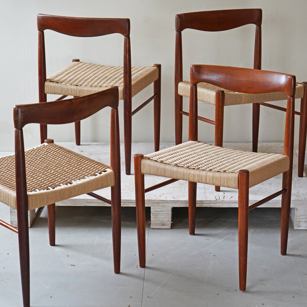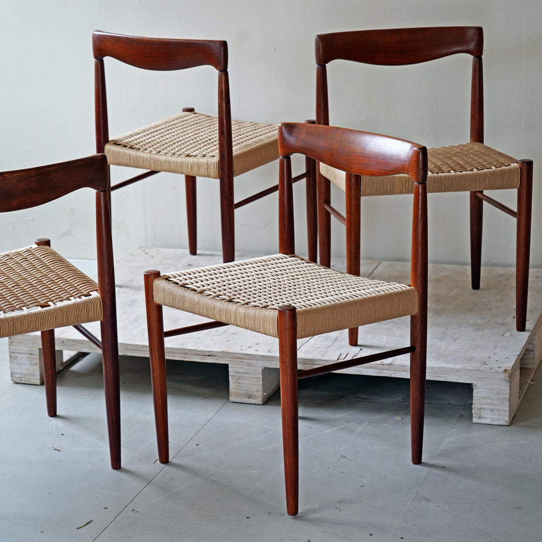 A refined set of four solid teak dining chairs designed by H.W. Klein for Bramin, featuring newly woven paper cord seats.