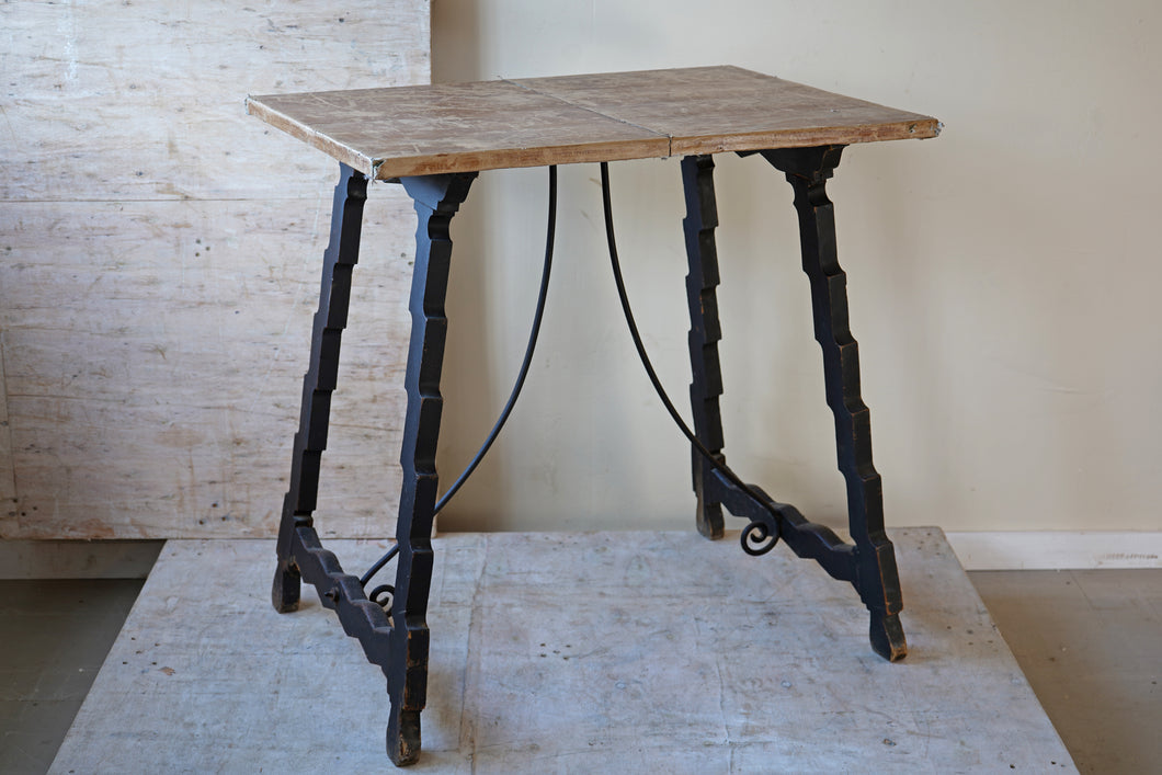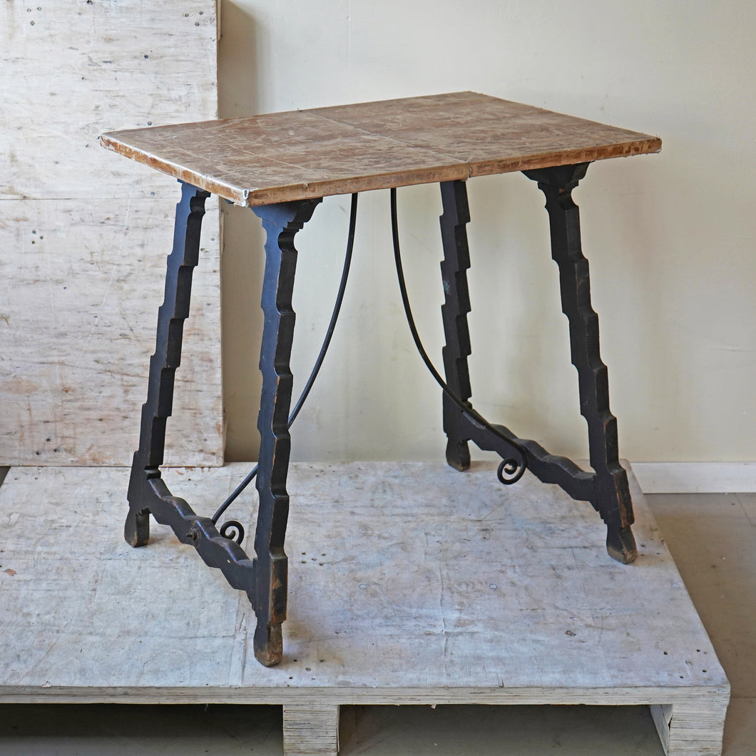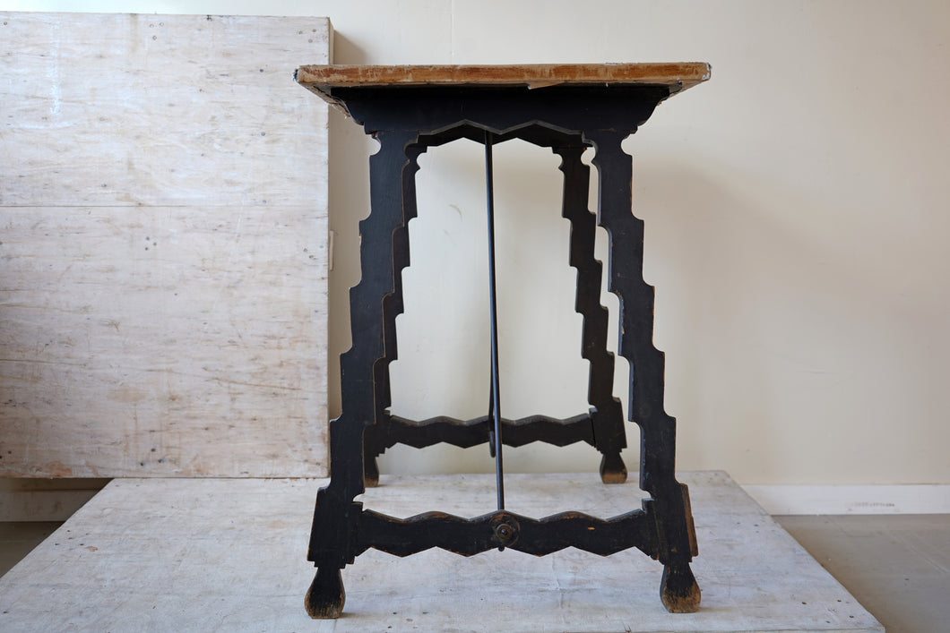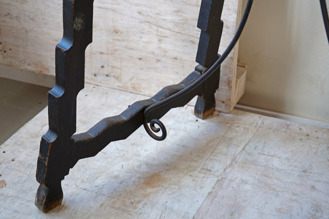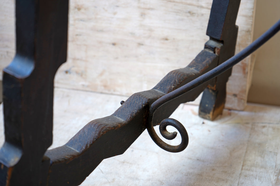 A beautiful Spanish console table featuring a richly textured leather top, iron stretchers, and boldly carved zig-zag legs. The leather surface shows lovely natural wear, adding warmth and character, while the legs display a deep, aged patina. A striking and authentic piece with great presence — perfect as a statement console or decorative accent in any interior.