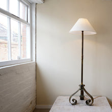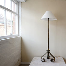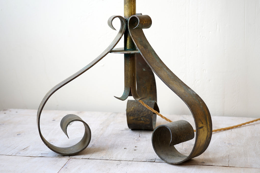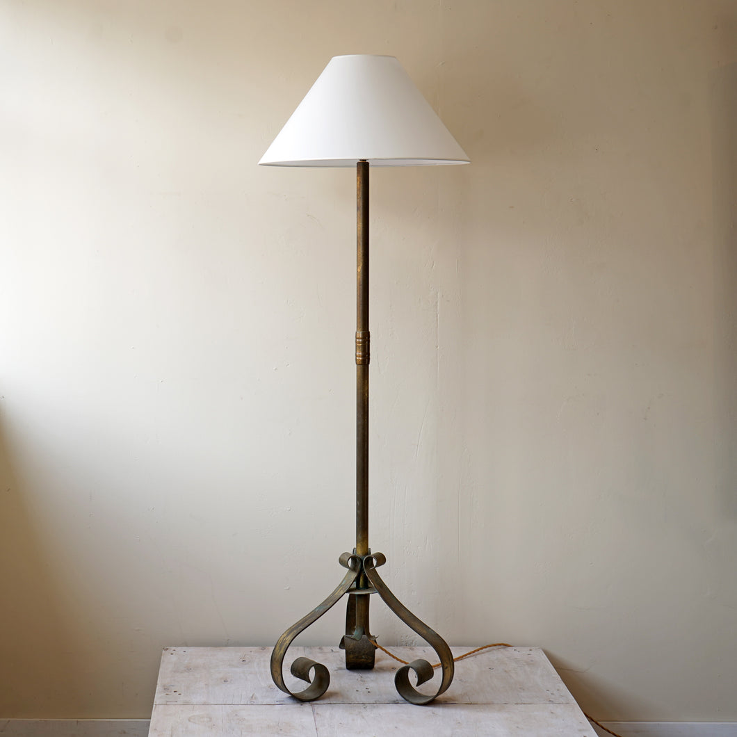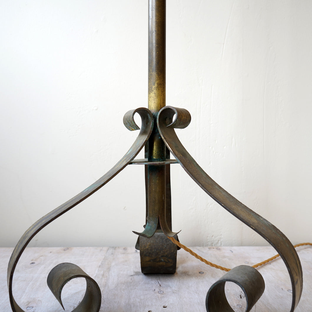 A decorative Spanish mid-20th century gilt iron floor lamp, featuring elegant spiral feet with hand beaten detailing. Recently re-wired and PAT tested.